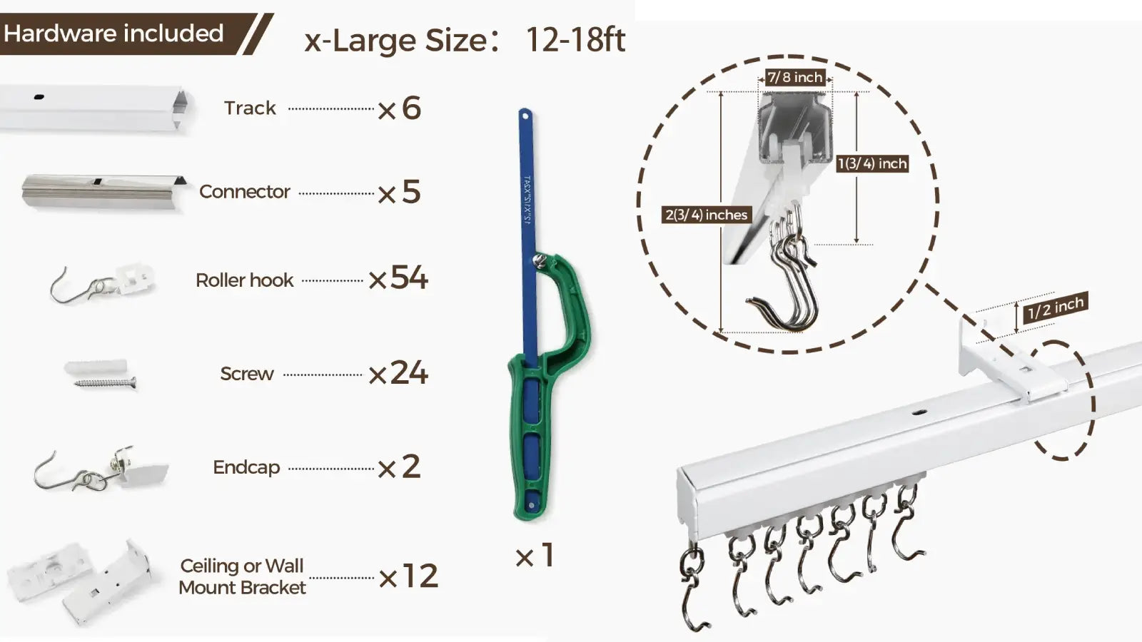 X-Large: 6 Tracks, 5 Connectors, 54 Roller Hooks, 24 Screws, 2 End Caps, 12 Ceiling or Wall Brackets, and 1 Saw.