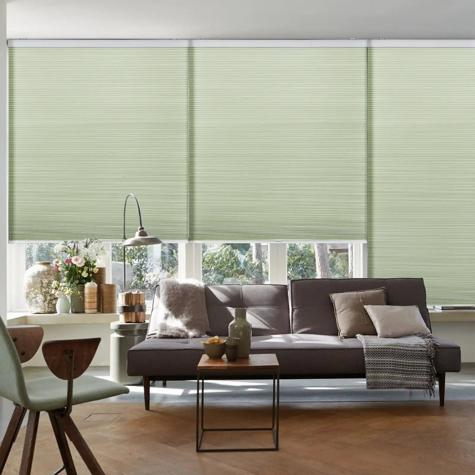 Cordless honeycomb blinds have a simple appearance with no hanging ropes or chains, making the overall look sleek and suitable for modern home styles.