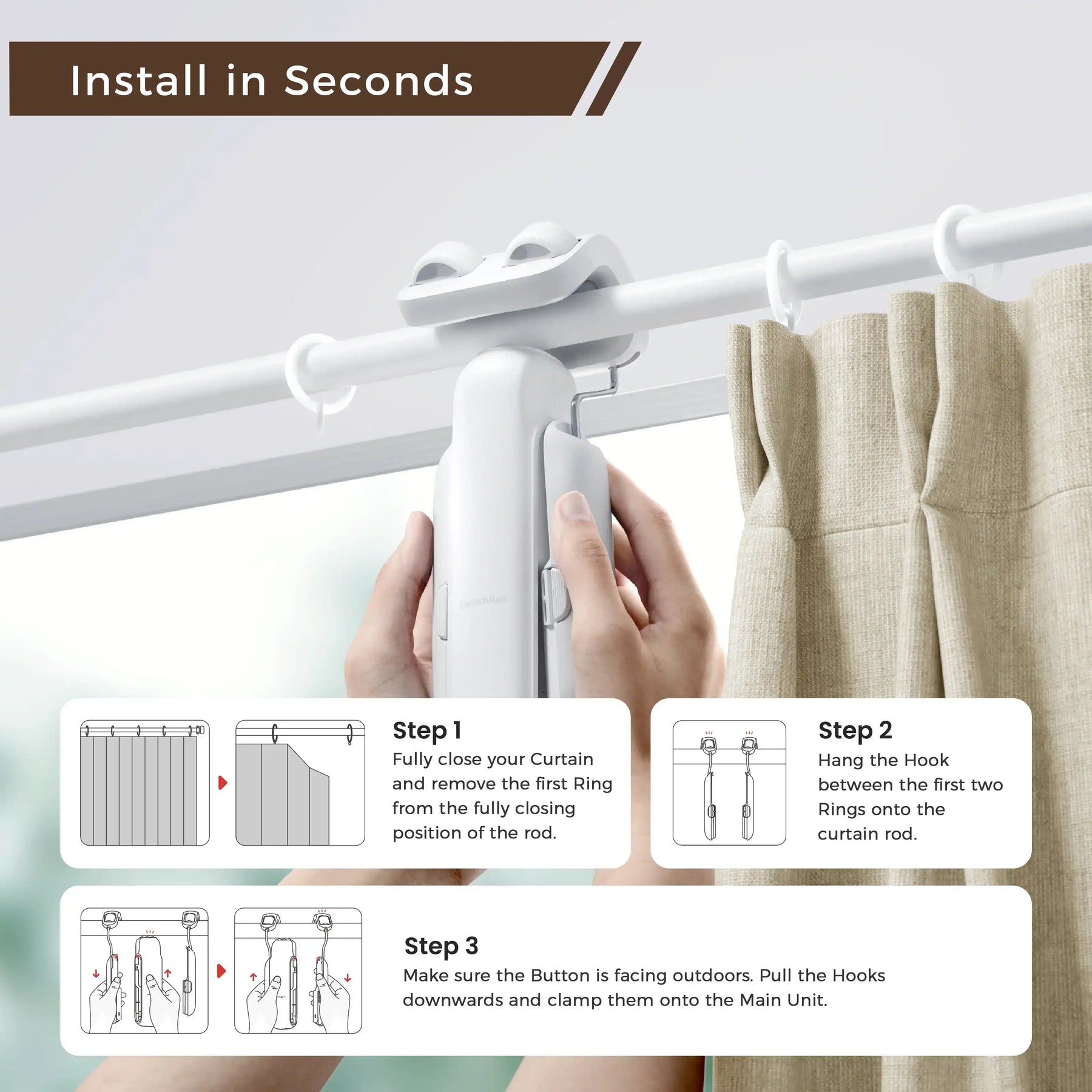 Upgrade your curtains to a smarter, more effortless experience. This automatic curtain opener is designed for U-rail tracks and rods and features a built-in solar panel for sustainable, low-maintenance power. Control open, close, or set your preferred opening percentage anytime via the app. With a compact design and simple installation, it works seamlessly with both new and existing curtains, making it an easy upgrade for modern living spaces.
