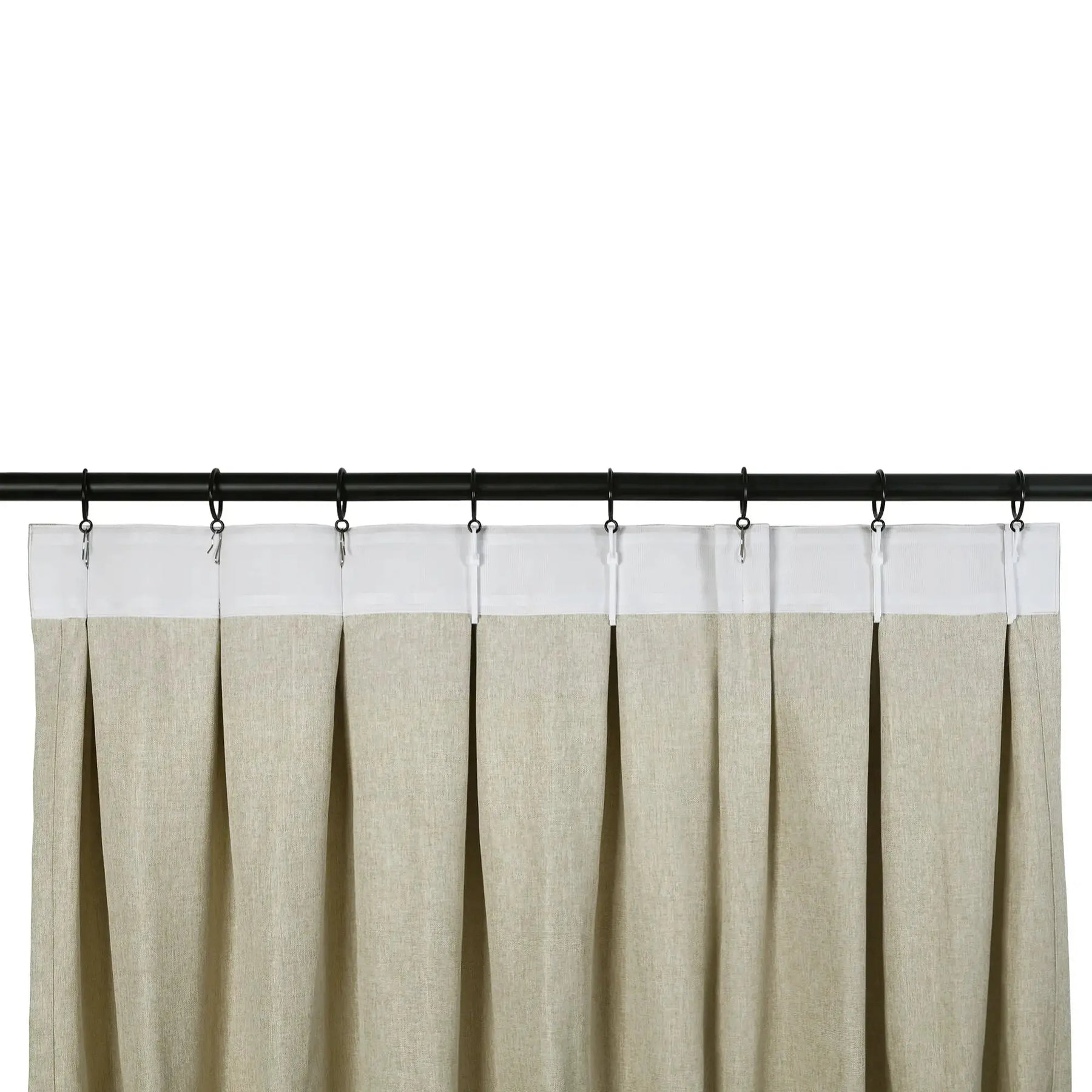 Pleats pin hooks quantity: 10 pleats for 50" width; 13 pleats for 72" width; 15 pleats for 84" width; 19 pleats for 100" width; 21 pleats for 110" width, 23 pleats for 120" width, 27 for 150" width. The width and space of the pleats may vary slightly depending on your track or pole length.