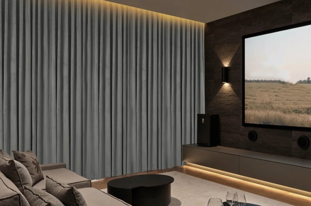 Blackout velvet curtains visually seclude the space, blocking light and distractions to ensure a focused, private viewing experience.